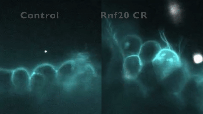 CRISPR depletion of RNF20 hinders cilia motility and fluid flow, as indicated by tracking fluorescent beads. Robson et al. (2019).
